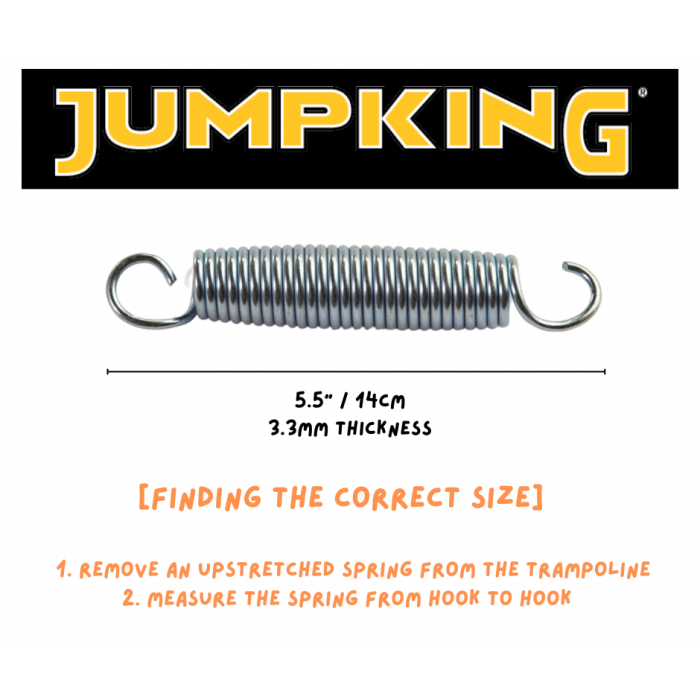 Description: Upkeep your trampoline's performance with JumpKing Trampoline Springs, designed for durability and superior bounce. Made from high-quality galvanized steel, these springs resist rust and wear, ensuring long-lasting use. Whether replacing old springs or upgrading your setup, JumpKing springs provide the strength and flexibility needed for a safe and enjoyable jumping experience.